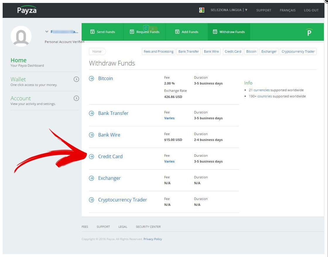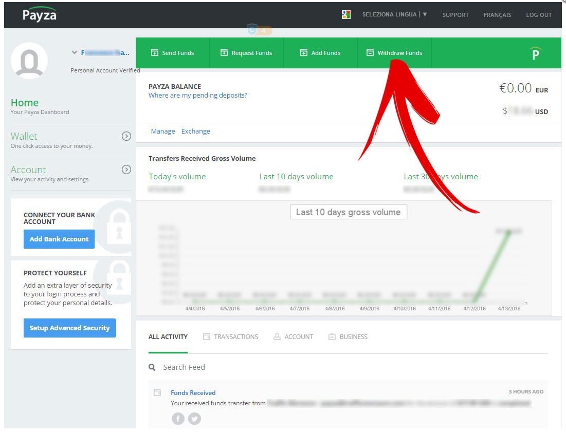 bene, questa è la nostra Dashboard, ora per collegare una carta di credito o un conto corrente al nostro account facciamo click su WITHDRAW FUNDS